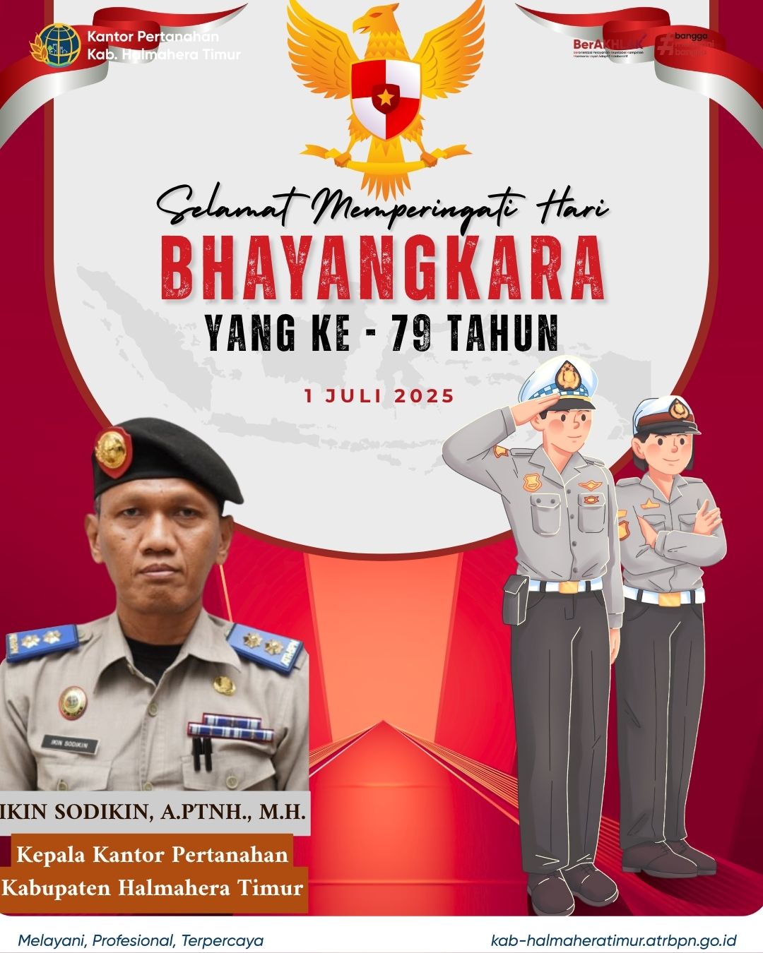 Halo #SobATRBPN Kepala Kantor Pertanahan Kabupaten Halmahera Timur beserta jajaran mengucapkan Dirgahayu HUT Bhayangkaran ke-79 . Momen ini menjadi kesempatan untuk menghargai dedikasi dan pengabdian para anggota Polri dalam menjaga keamanan, ketertiban, serta menegakkan hukum di seluruh Indonesia.
