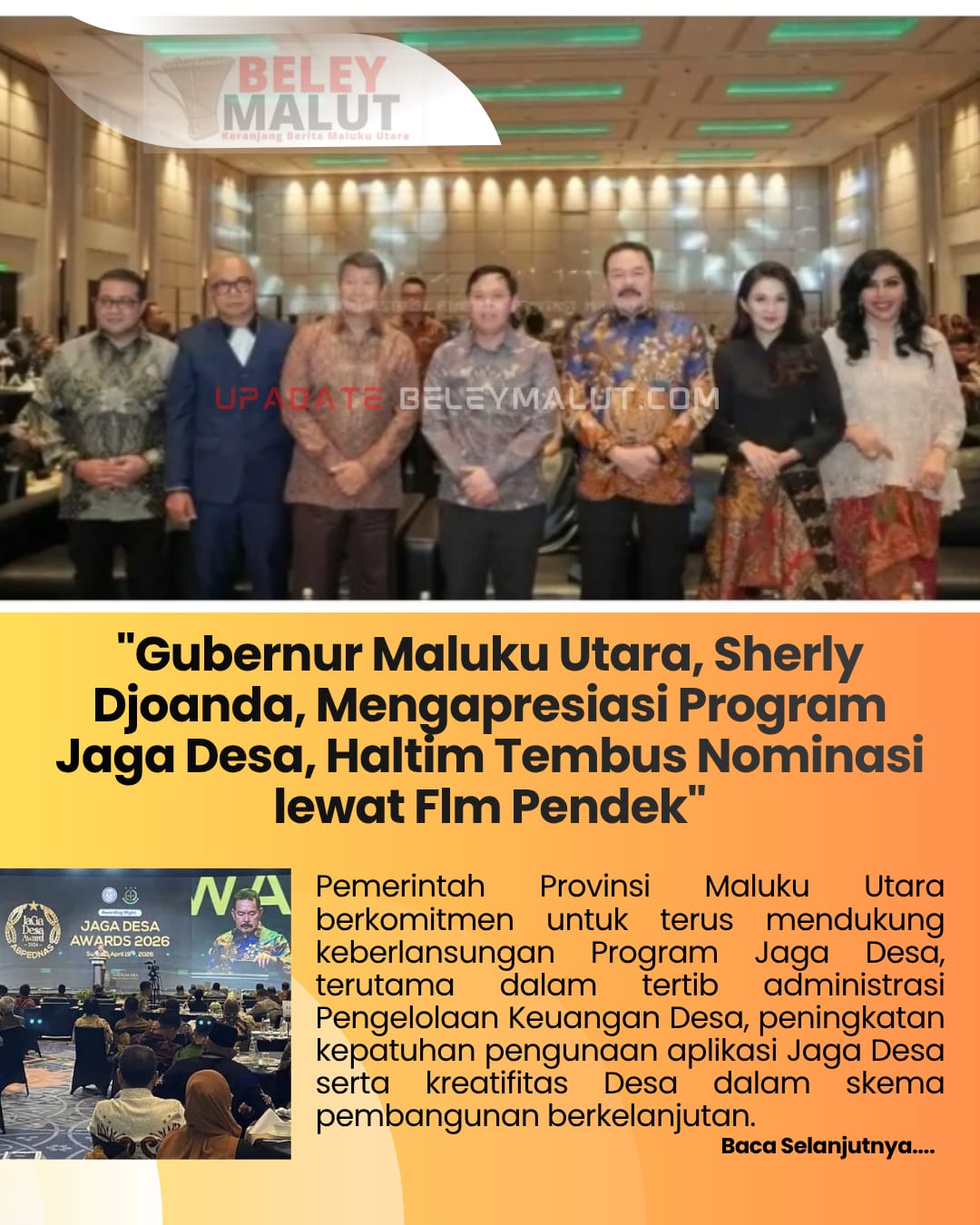 Maluku Utara-beleymalut.com- Gubernur Maluku Utara, Sherly Djoanda, menghadiri ajang Jaga Desa Awards 2026 yang digelar di Ballroom Fairmont Hotel, Minggu (19/4/2026). Dalam kesempatan itu, ia menyampaikan apresiasi kepada jajaran kejaksaan atas keberhasilan program Jaksa Garda Desa (Jaga Desa) dalam mendorong tata kelola pemerintahan desa yang transparan dan akuntabel.