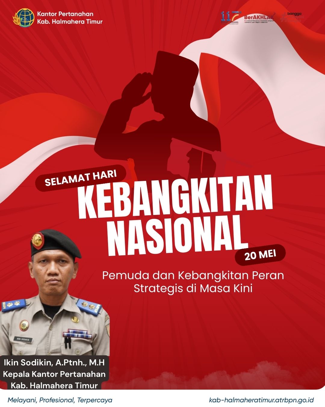 Halo #SobATRBPN Kantor Pertanahan Kabupaten Halmahera Timur beserta jajaran mengucapkan Selamat Hari Kebangkitan Nasional 117 Tahun . Pemuda dan kebangkitan peran strategi di masa kini. Dengan mengangkat tema Bangkit Bersama Wujudkan Indonesia Kuat merefleksikan semangat kolektif seluruh komponen bangsa untuk bangkit dari berbagai tantangan dan krisis yang ihadapi, serta bergerak maju menuju Indonesia yang lebih kuat, mandiri, dan sejahtera
