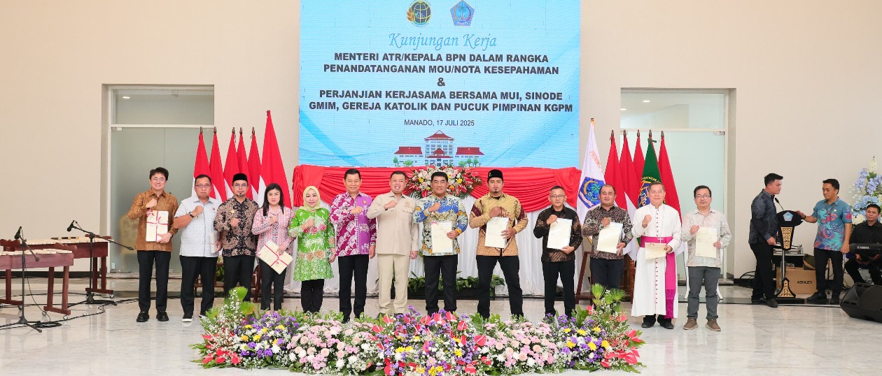 Nasional-BM.Com_Menteri Agraria dan Tata Ruang/Kepala Badan Pertanahan Nasional (ATR/BPN), Nusron Wahid, menyerahkan sejumlah sertipikat tanah kepada pemerintah daerah (Pemda) dan lembaga keagamaan di Sulawesi Utara (Sulut), Kamis (17/07/2025). Dalam kesempatan tersebut, ia menegaskan komitmen pemerintah untuk menyelesaikan pekerjaan rumah (PR) di sektor pertanahan, khususnya dalam masa pemerintahan Presiden Prabowo.