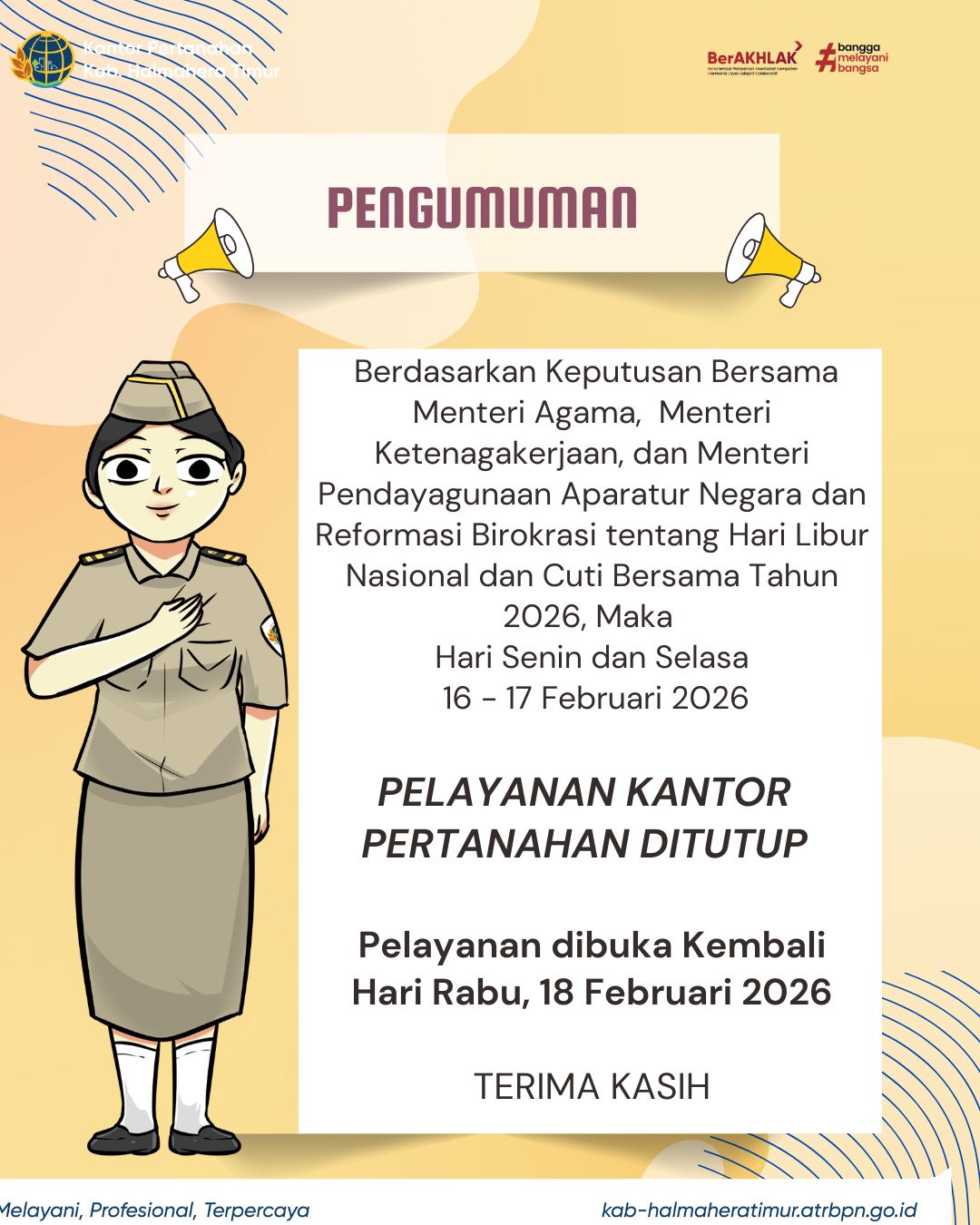 Halo #SobATRBPN Berdasarkan Keputusan Bersama Surat dari Menteri Agama, Menteri Ketenagakerjaan dan Menteri Pendayagunaan Aparatur Negara dan Reformasi Birokrasi Tentang Hari Libur Nasional dan Cuti Bersama Tahun 2026, maka Pelayanan Kantor Pertanahan Kabupaten Halmahera Timur Hari Senin dan Selasa, 16 -17 Februari 2026 Resmi ditutup, dan akan dibuka kembali pada Hari Rabu, 18 Februari 2026.