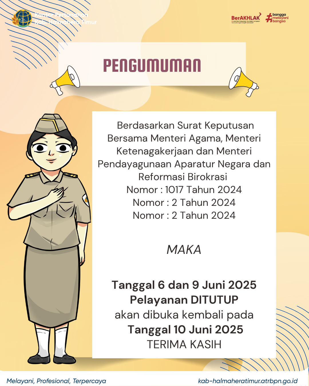 Halo #SobATRBPN Berdasarkan Surat Keputusan Bersama Menteri Agama, Menteri Ketenagakerjaan dan Menteri Pendayagunaan Aparatur Negara dan Reformasi Birokrasi nomor : 1017 Tahun 2024, nomor 2 Tahun 2024 dan nomor 2 Tahun 2024 Tentang Hari Libur Nasional dan Cuti Bersama Tahun 2025 maka Tanggal 6 dan 9 Juni 2025 pelayanan di Kantor Pertanahan Kabupaten Halmahera Timur DITUTUP dan akan DIBUKA kembali pada tanggal 10 Juni 2025. Terima kasih