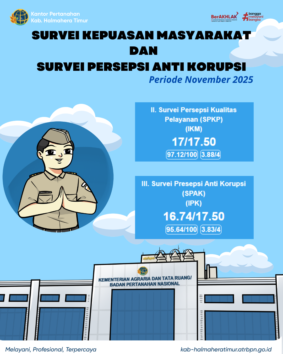 Halo #SobATRBPN Berikut hasil Survey Kepuasan Masyarakat Kantor Pertanahan Kabupaten Halmahera Timur Periode Bulan November 2025. Kami sangat menghargai dukungan seluruh pengguna layanan Kantor Pertanahan Kabupaten Halmahera Timur dengan tidak memberikan gratifikasi dalam bentuk apapun terhadap layanan yang kami berikan.